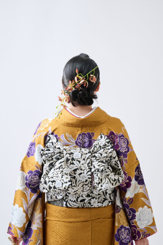 正面 背面 正面アップ 髪 からし色 黄色・オレンジ 花柄 155cm-160cm(7寸5分) からし色の地に紫のバラが入った着物です。 どこか落ち着きも感じる、大人っぽい一着。 お気に入りに追加 お問い合わせ