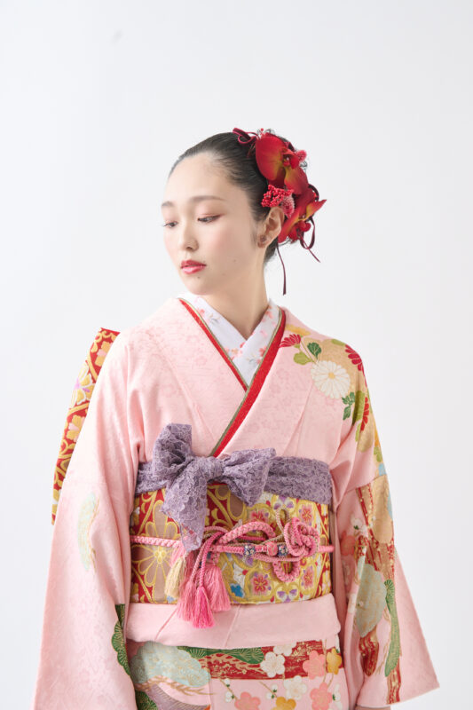 淡いピンクの地に、色とりどりの花模様をあしらった振袖。