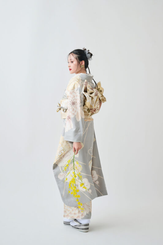 柔らかなグレー色の地に、牡丹の花々が優しく描かれた可憐な振袖。