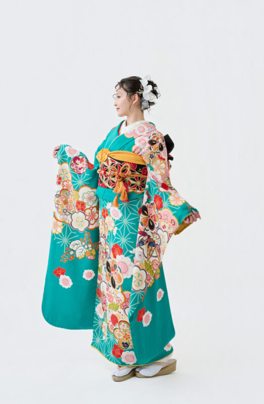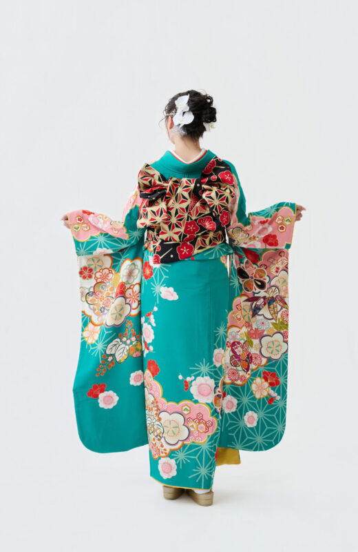 澄んだマリンブルーの地色に、赤と白の花模様が美しく映える一着。