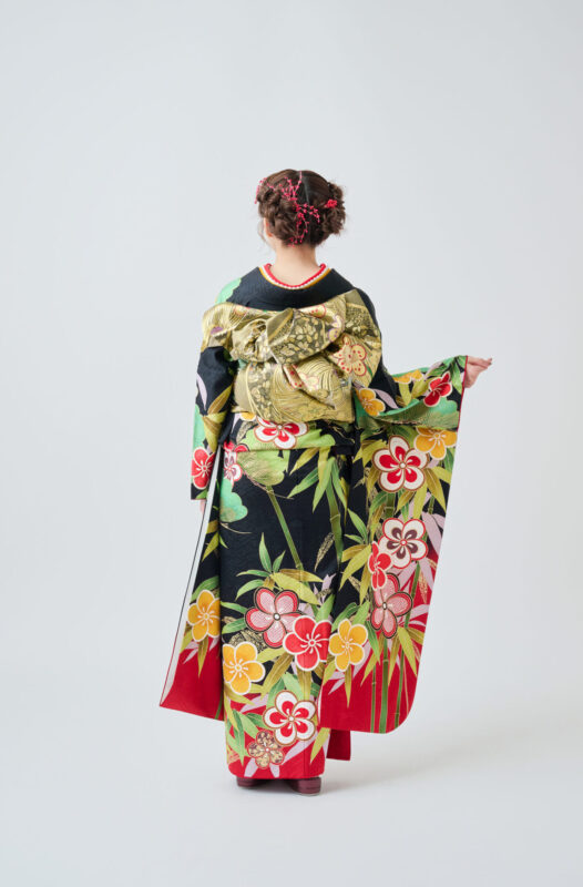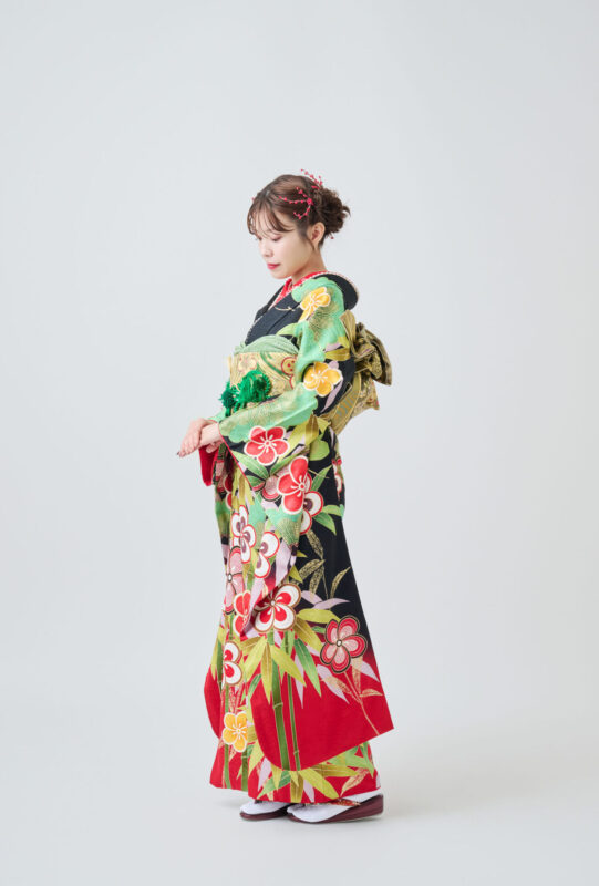 落ち着いた黒をベースに、緑の竹と松、赤い花が印象的な一着。