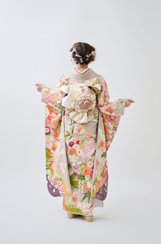 甘さを抑えた色使いで、どこか今っぽい、やわらかな華やぎを楽しめる一着です。