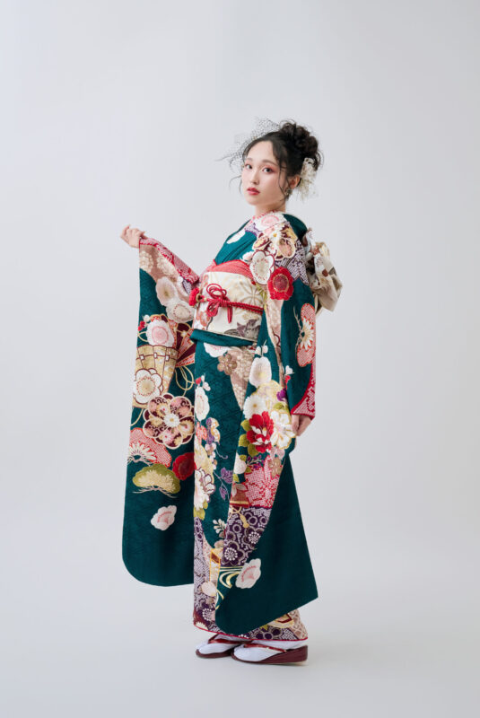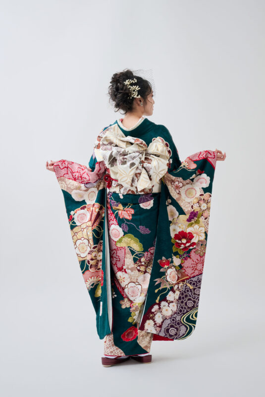 赤・白・紫の絞り模様をあしらった存在感のある一着。